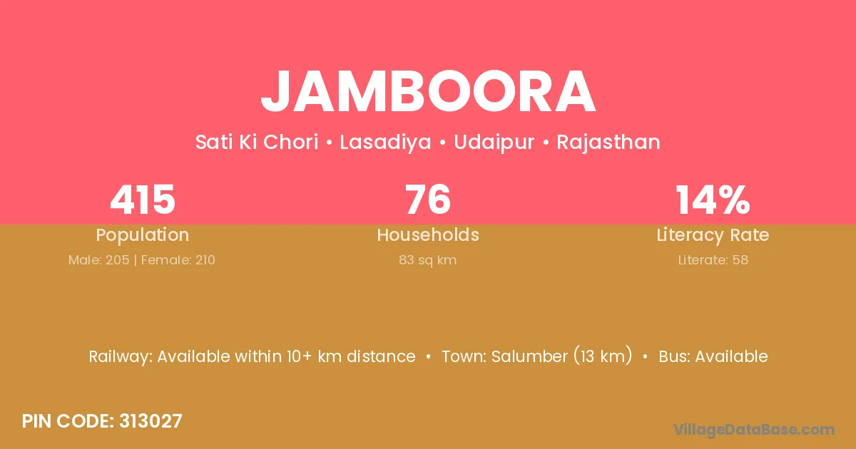 Salumber (22 km) is the nearest town to Jamboora village for major economic activities and is located approximately 22 km away.