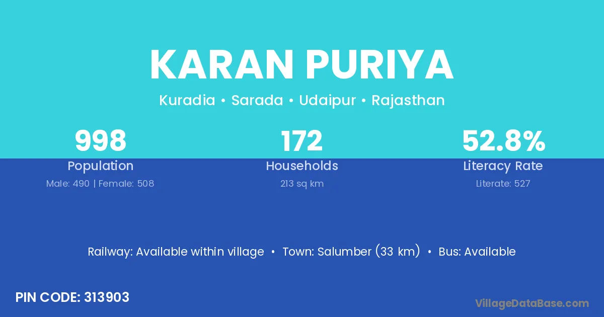Salumber (33 km) is the nearest town to Karan Puriya village for major economic activities and is located approximately 33 km away.