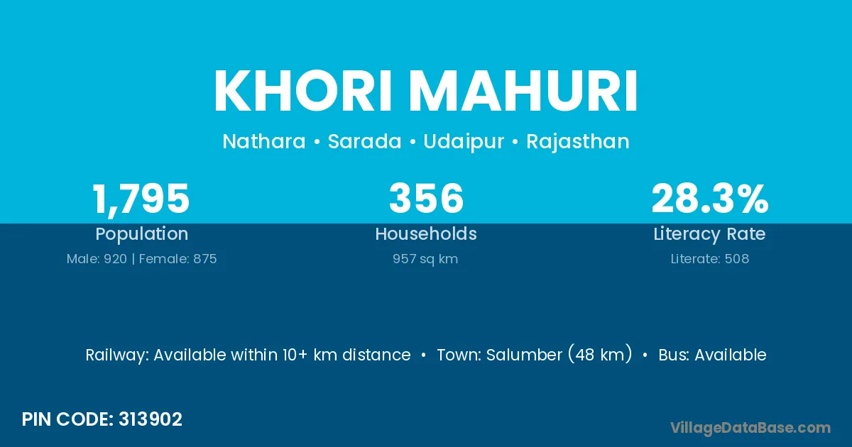 Salumber (48 km) is the nearest town to Khori Mahuri village for major economic activities and is located approximately 48 km away.