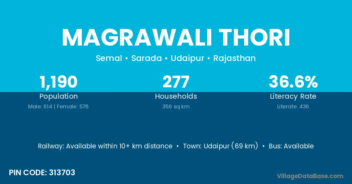 Udaipur (69 km) is the nearest town to Magrawali Thori village for major economic activities and is located approximately 69 km away.