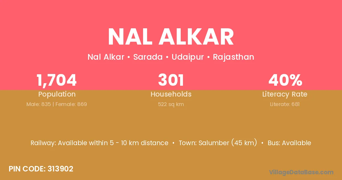 Salumber (45 km) is the nearest town to Nal Alkar village for major economic activities and is located approximately 45 km away.