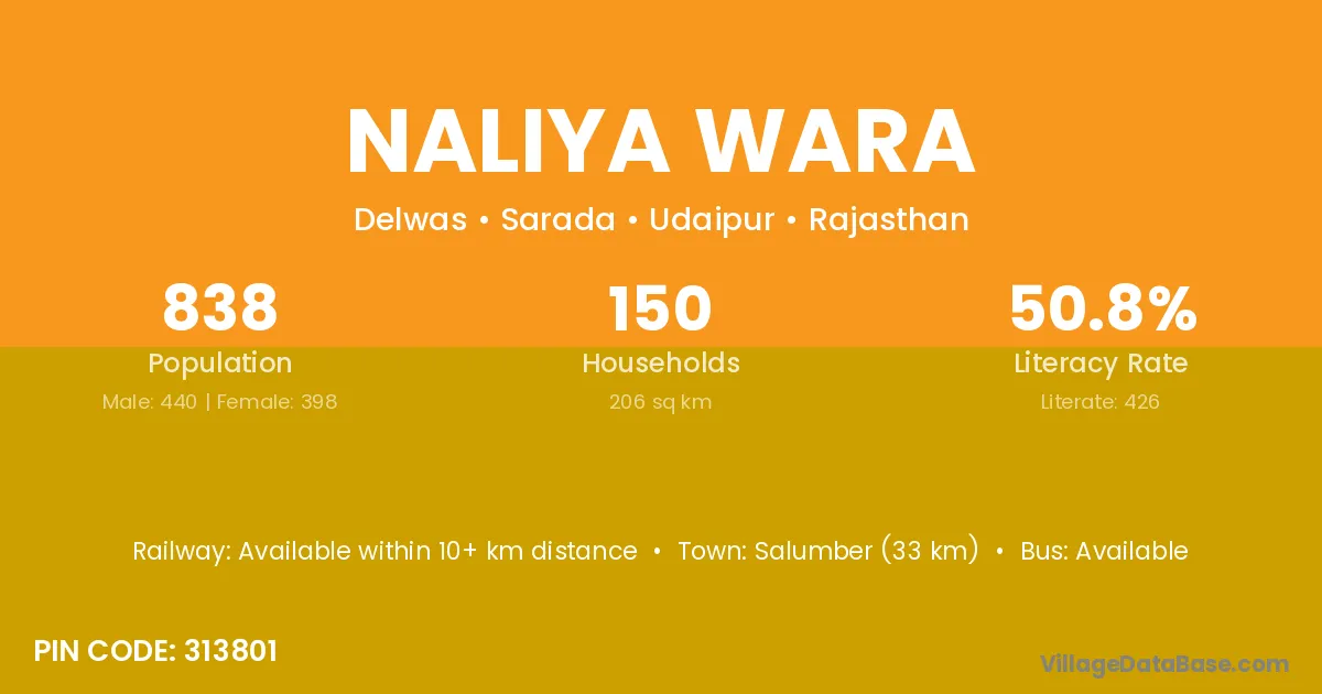 Salumber (33 km) is the nearest town to Naliya Wara village for major economic activities and is located approximately 33 km away.