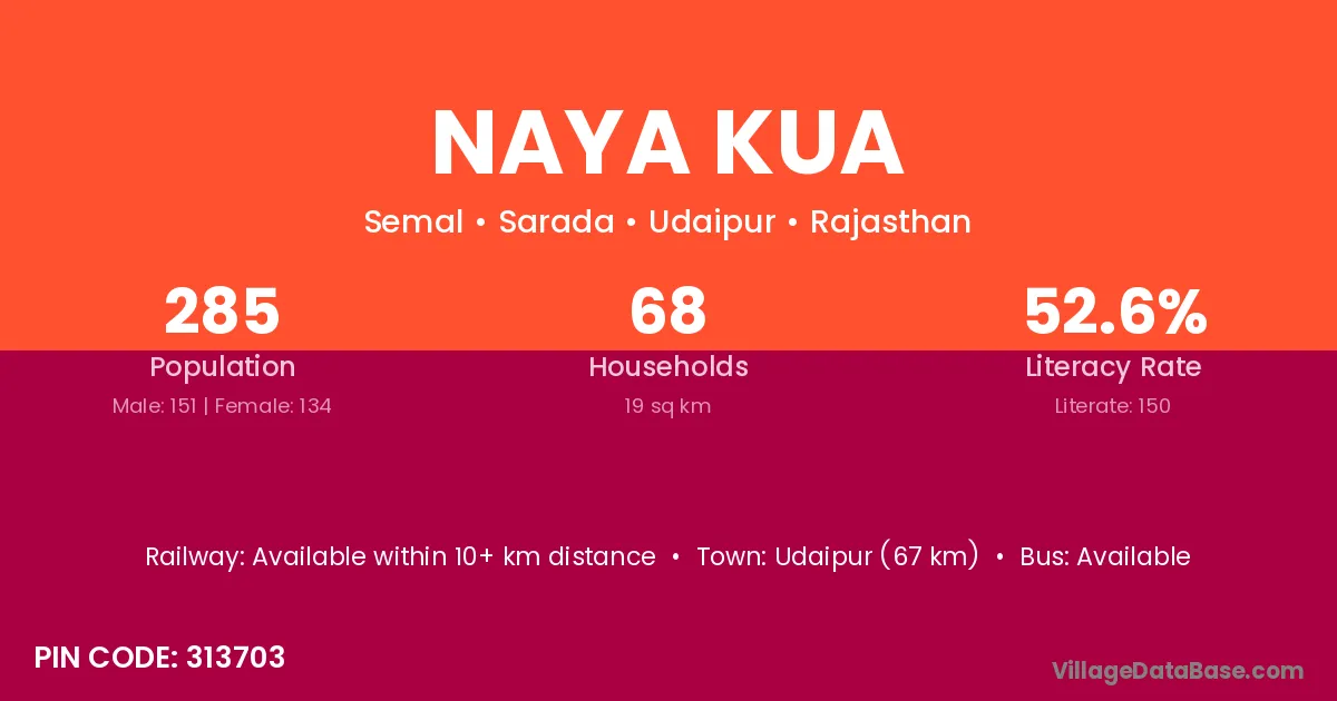 Udaipur (67 km) is the nearest town to Naya Kua village for major economic activities and is located approximately 67 km away.