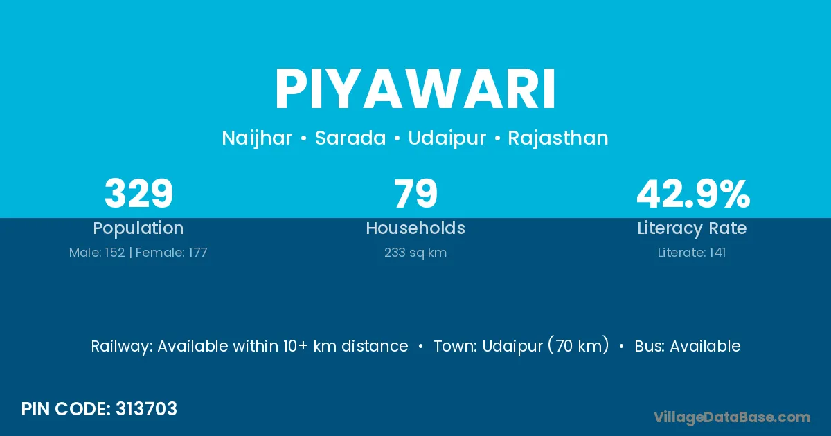 Udaipur (70 km) is the nearest town to Piyawari village for major economic activities and is located approximately 70 km away.