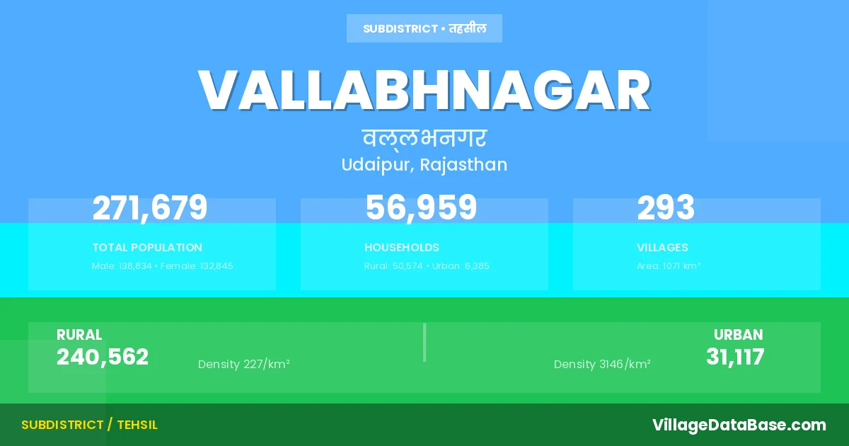 According to the 2011 census The total area of Vallabhnagar Tehsil is 1071 km², with a population of 271679 people. The population density is 254 inhabitants per square kilometre, and there are approximately 56959 houses in the sub district.