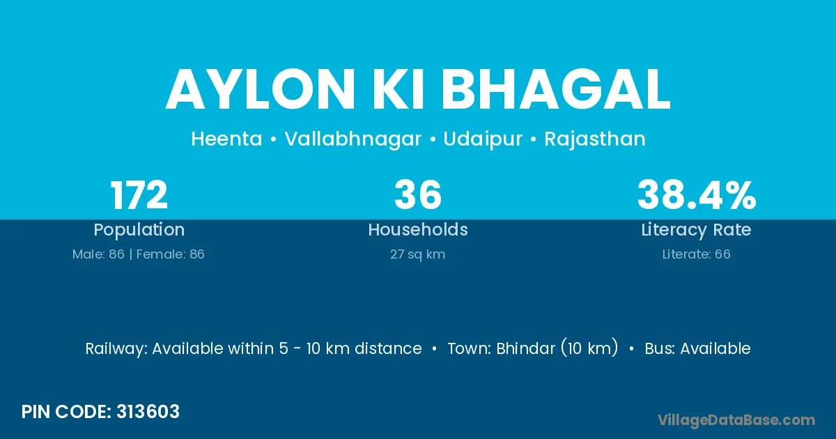 Bhindar (10 km) is the nearest town to Aylon Ki Bhagal village for major economic activities and is located approximately 10 km away.