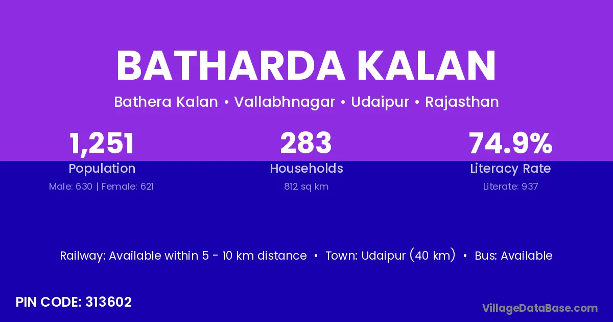Udaipur (40 km) is the nearest town to Batharda Kalan village for major economic activities and is located approximately 40 km away.
