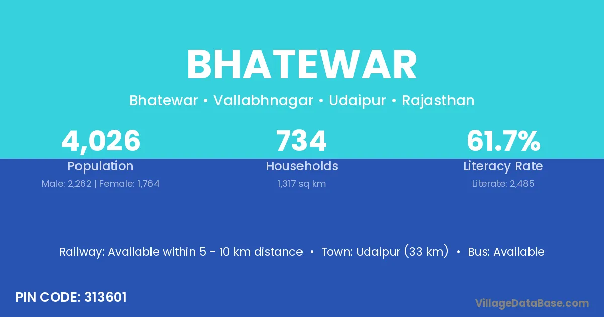 Udaipur (33 km) is the nearest town to Bhatewar village for major economic activities and is located approximately 33 km away.