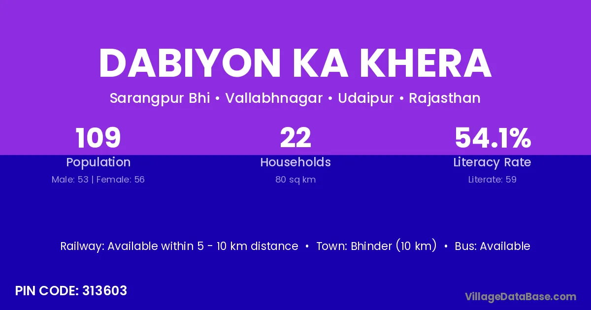 Dabiyon Ka Khera village has a total population of 109 people, of which 53 are males and 56 are females.