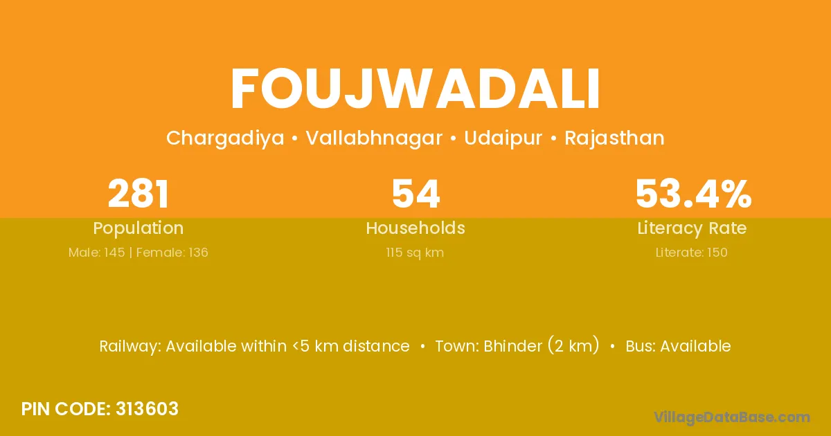 Bhinder (2 km) is the nearest town to Foujwadali village for major economic activities and is located approximately 2 km away.