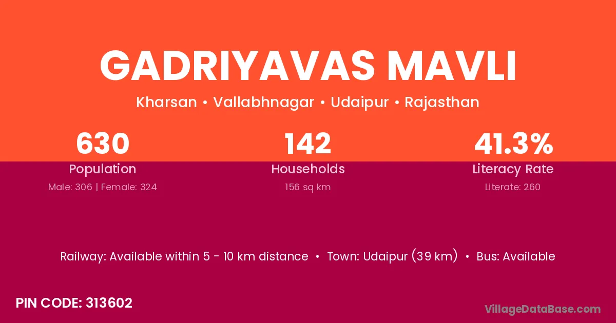 Gadriyavas Mavli village has a total population of 630 people, of which 306 are males and 324 are females.