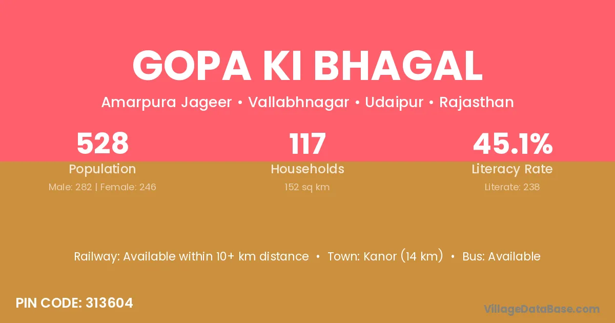 Gopa Ki Bhagal village has a total population of 528 people, of which 282 are males and 246 are females.
