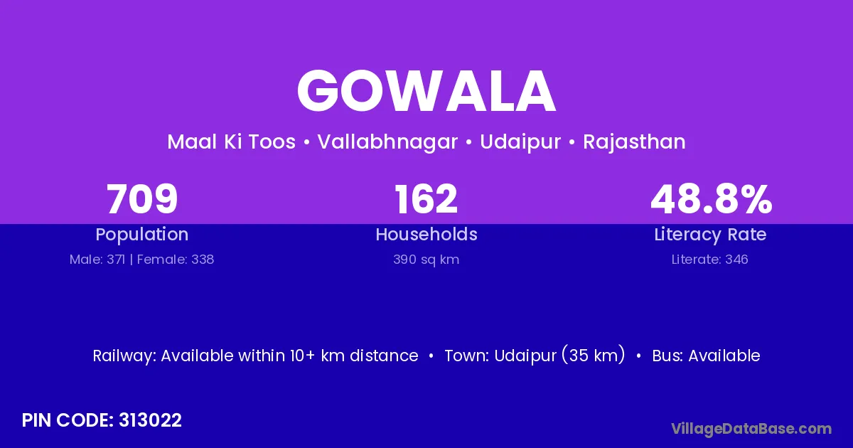 According to Census 2011 information, the village code of Gowala village is 313022.