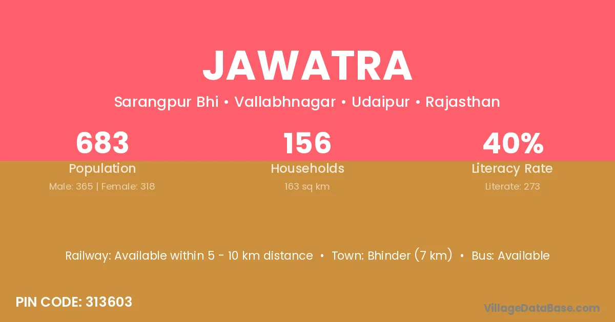 Jawatra village has a total population of 683 people, of which 365 are males and 318 are females.