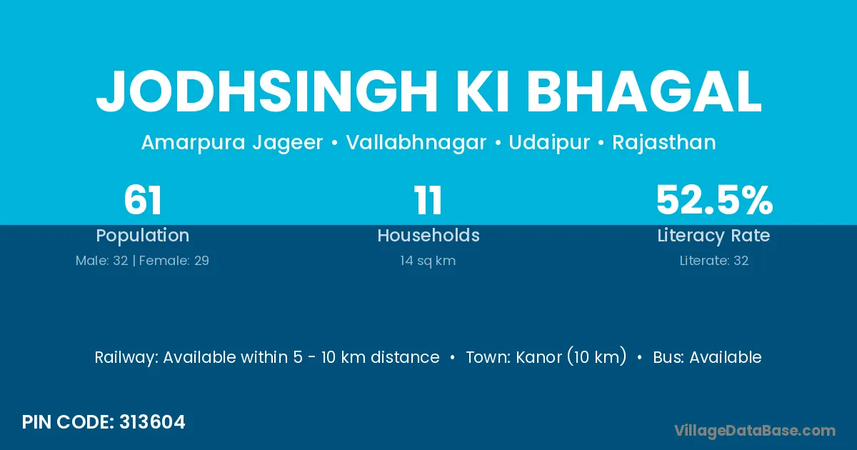 Jodhsingh Ki Bhagal village has a total population of 61 people, of which 32 are males and 29 are females.