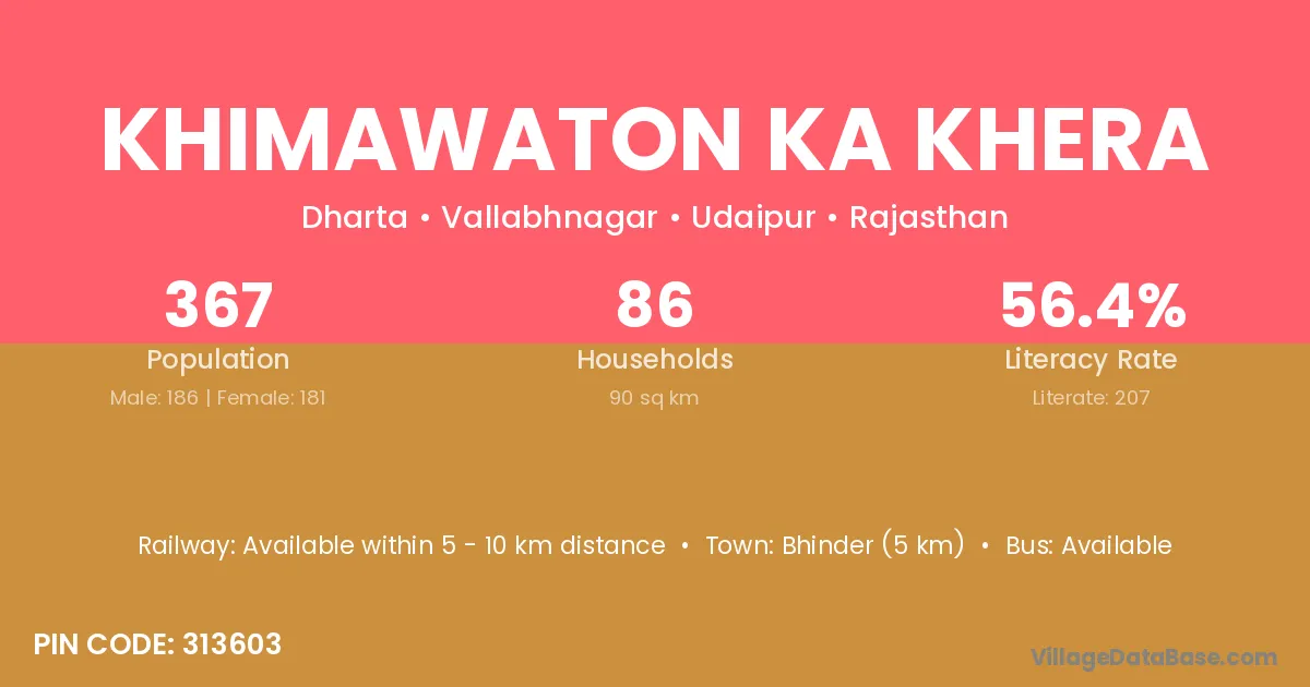 Khimawaton Ka Khera village has a total population of 367 people, of which 186 are males and 181 are females.