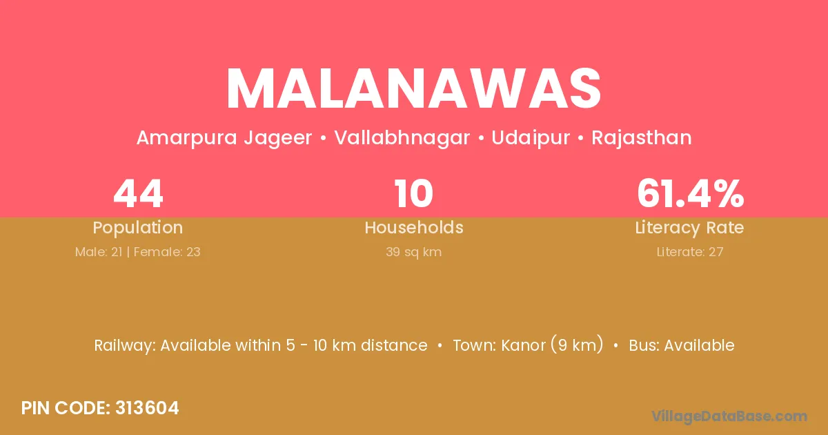 Malanawas village has a total population of 44 people, of which 21 are males and 23 are females.