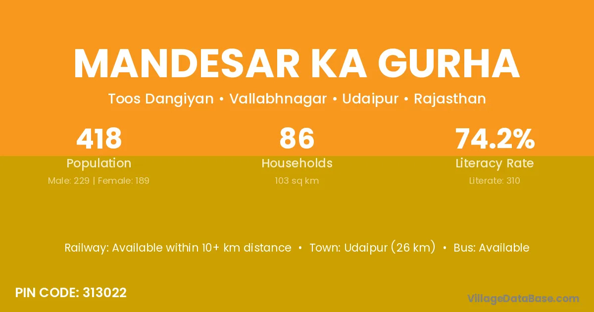 Udaipur (26 km) is the nearest town to Mandesar Ka Gurha village for major economic activities and is located approximately 26 km away.