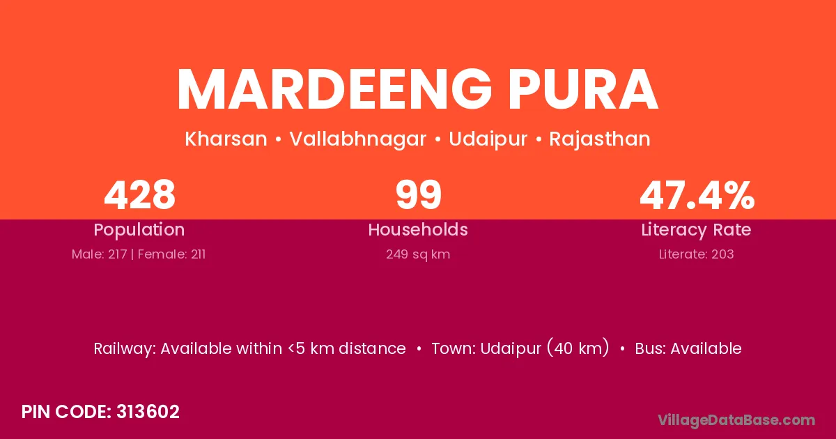 Udaipur (40 km) is the nearest town to Mardeeng Pura village for major economic activities and is located approximately 40 km away.