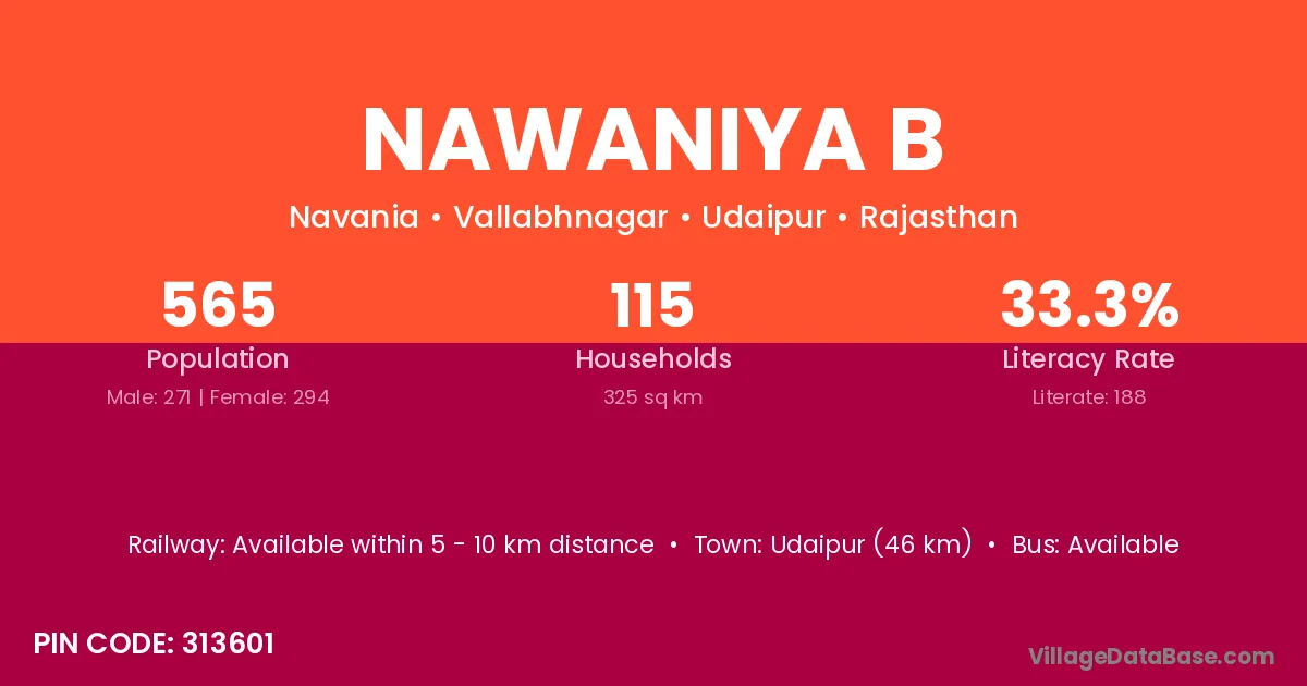 Udaipur (46 km) is the nearest town to Nawaniya B village for major economic activities and is located approximately 46 km away.