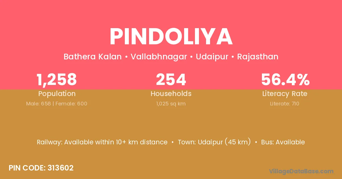 Udaipur (45 km) is the nearest town to Pindoliya village for major economic activities and is located approximately 45 km away.