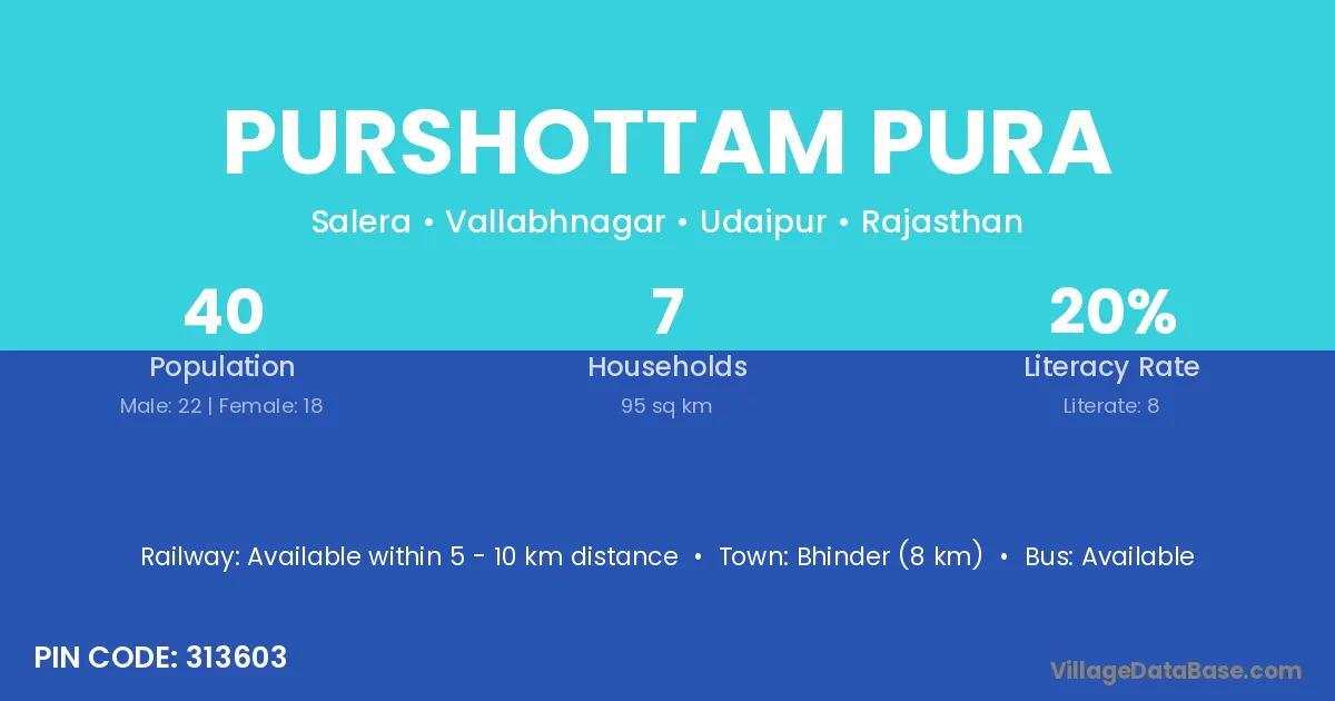 Purshottam Pura village has a total population of 40 people, of which 22 are males and 18 are females.
