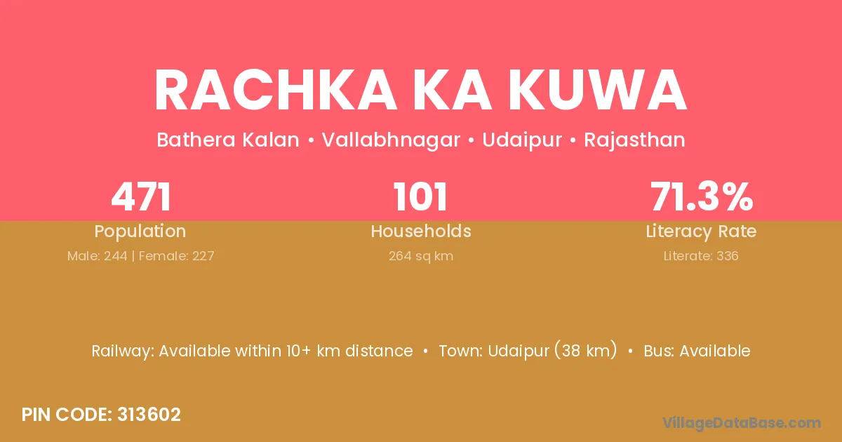 Udaipur (38 km) is the nearest town to Rachka Ka Kuwa village for major economic activities and is located approximately 38 km away.