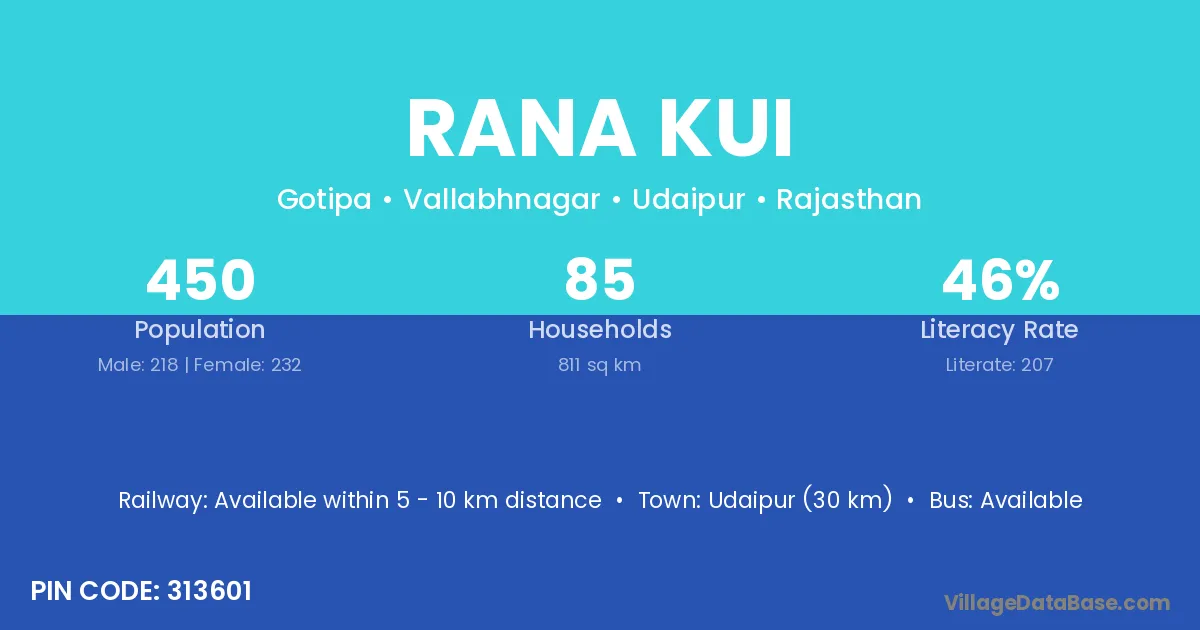 Rana Kui village has a total population of 450 people, of which 218 are males and 232 are females.