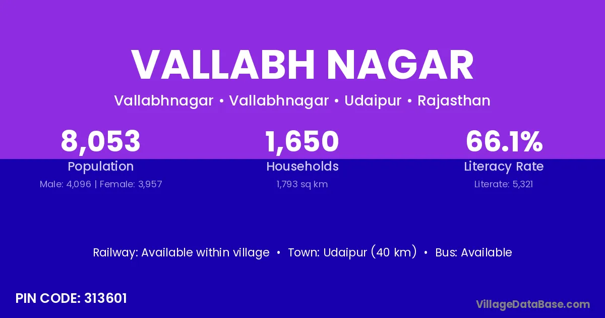 Udaipur (40 km) is the nearest town to Vallabh Nagar village for major economic activities and is located approximately 40 km away.