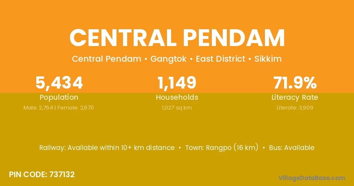 Rangpo (16 km) is the nearest town to Central Pendam village for major economic activities and is located approximately 16 km away.