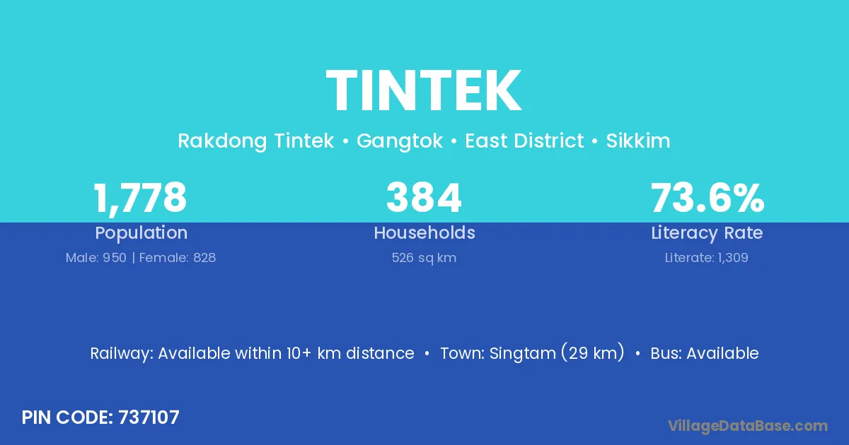 Singtam (29 km) is the nearest town to Tintek village for major economic activities and is located approximately 29 km away.