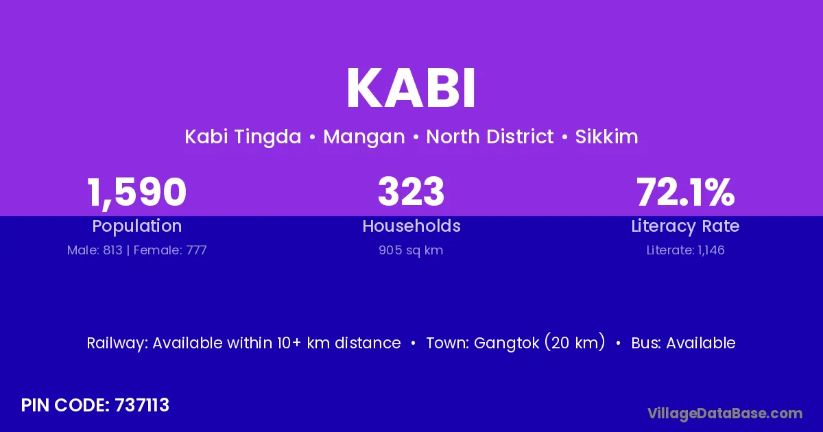 Gangtok (20 km) is the nearest town to Kabi village for major economic activities and is located approximately 20 km away.