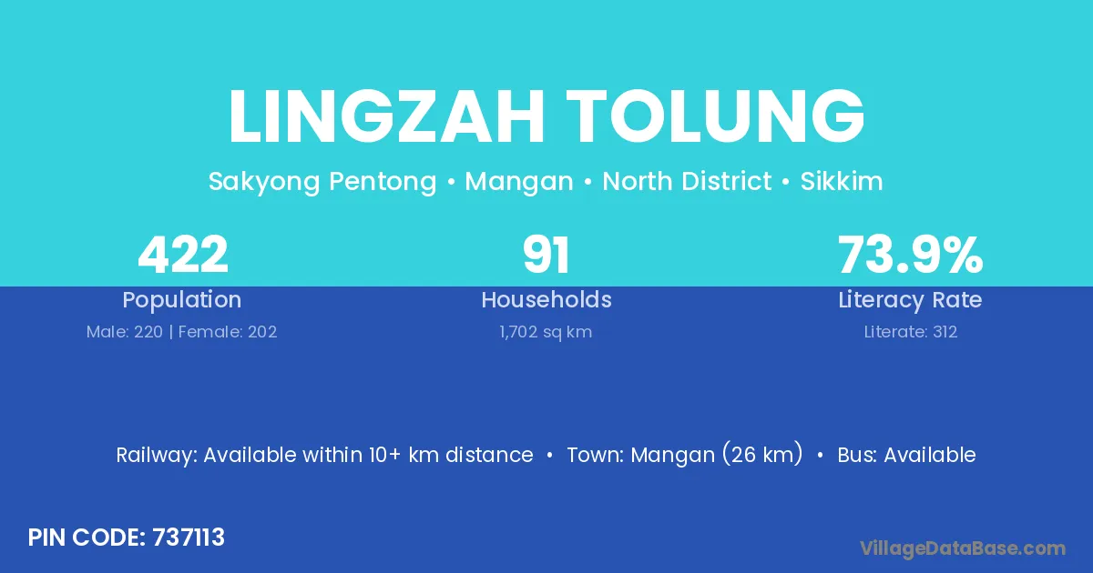 Lingzah Tolung village has a total population of 422 people, of which 220 are males and 202 are females.