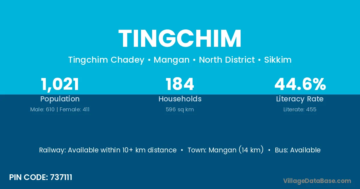 Mangan (14 km) is the nearest town to Tingchim village for major economic activities and is located approximately 14 km away.