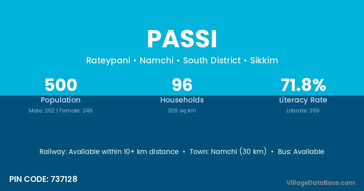 Namchi (30 km) is the nearest town to Passi village for major economic activities and is located approximately 30 km away.