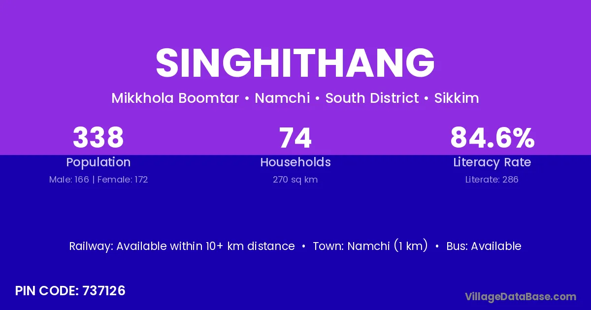 Namchi (1 km) is the nearest town to Singhithang village for major economic activities and is located approximately 1 km away.
