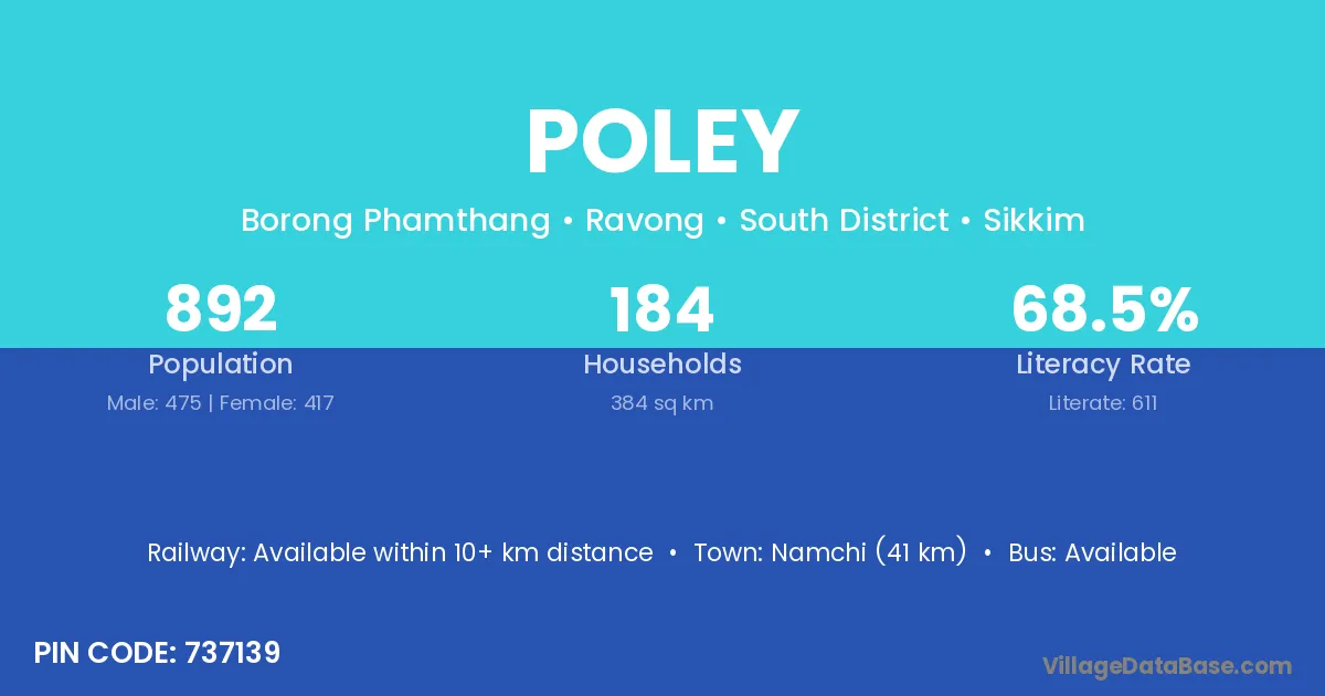 Namchi (41 km) is the nearest town to Poley village for major economic activities and is located approximately 41 km away.