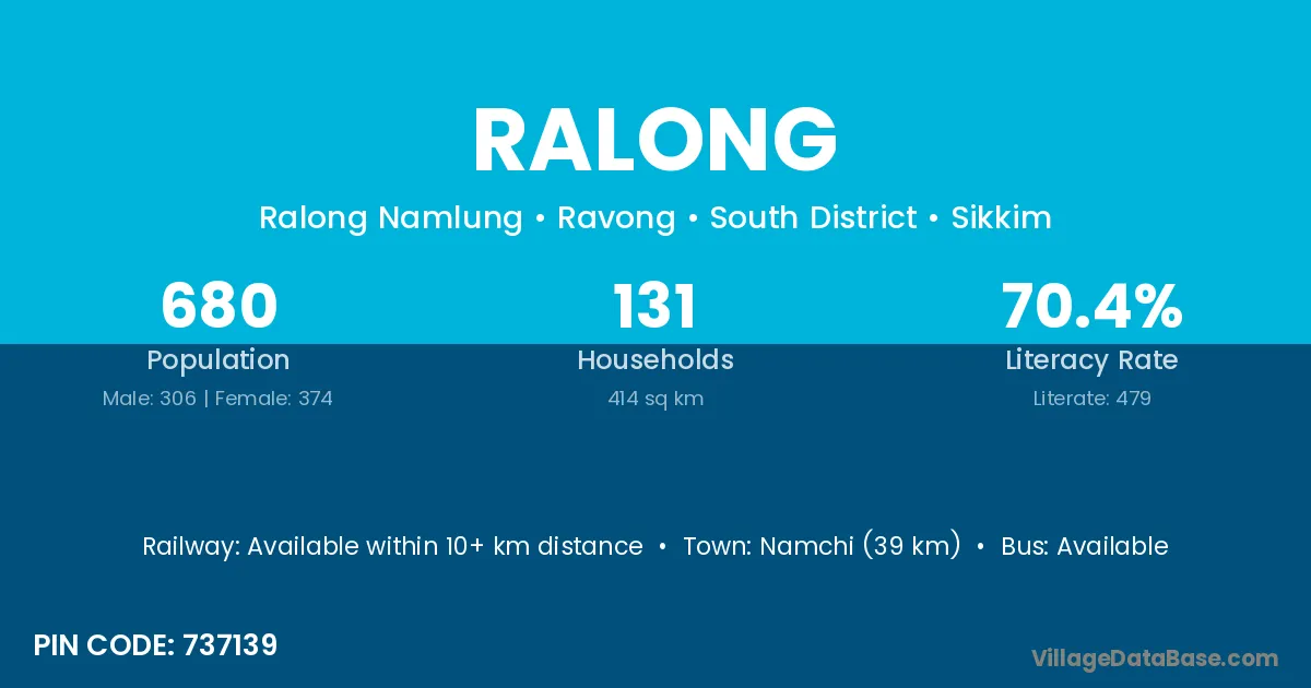 Namchi (39 km) is the nearest town to Ralong village for major economic activities and is located approximately 39 km away.