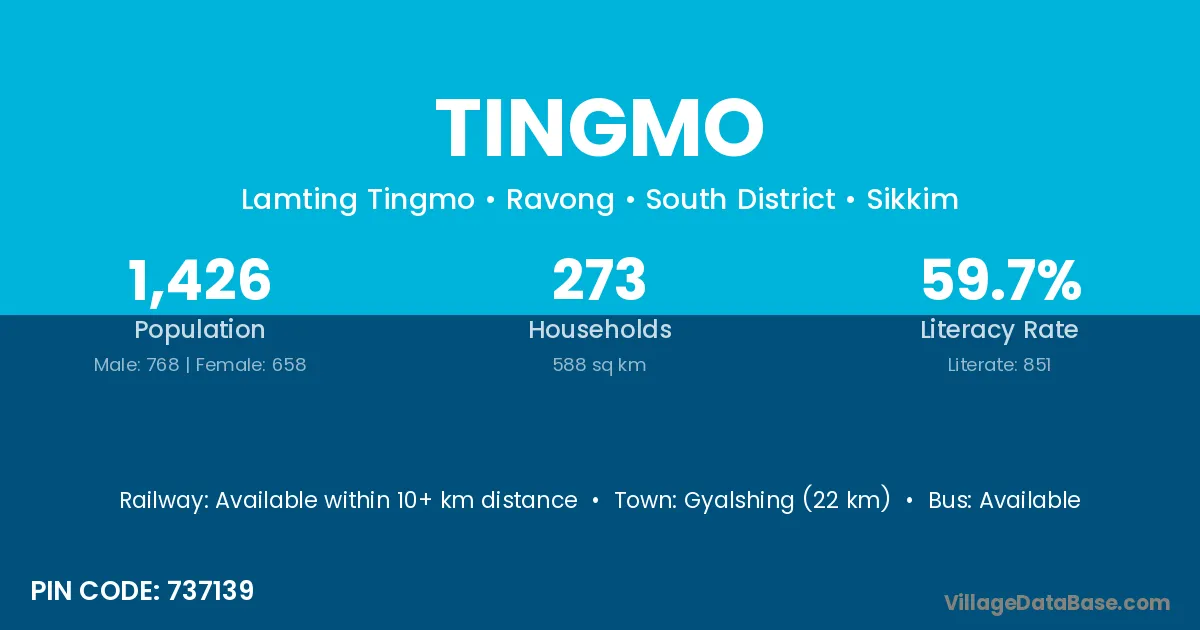 Tingmo village has a total population of 1,426 people, of which 768 are males and 658 are females.