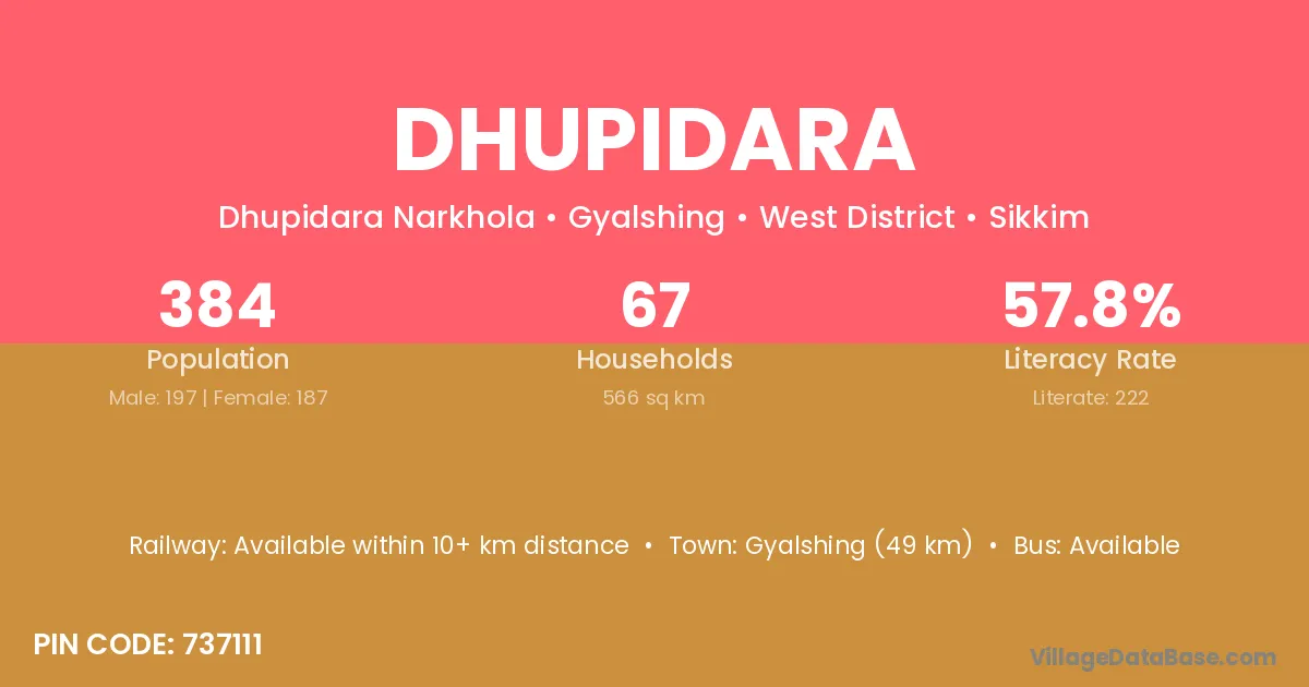 Gyalshing (49 km) is the nearest town to Dhupidara village for major economic activities and is located approximately 49 km away.