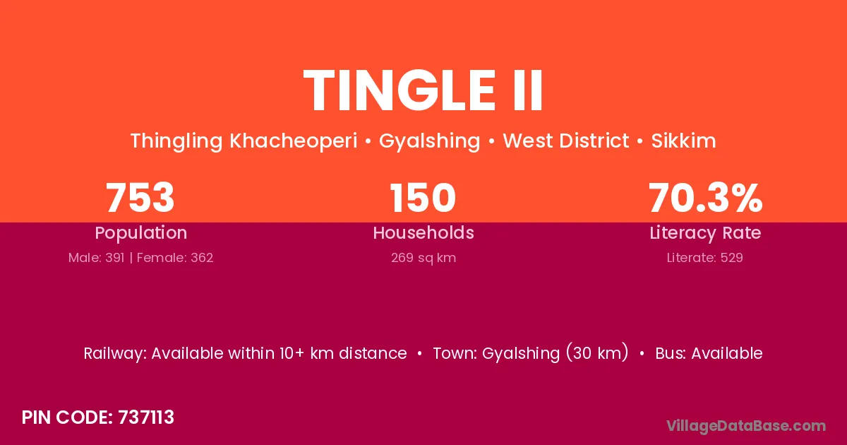 Gyalshing (30 km) is the nearest town to Tingle Ii village for major economic activities and is located approximately 30 km away.