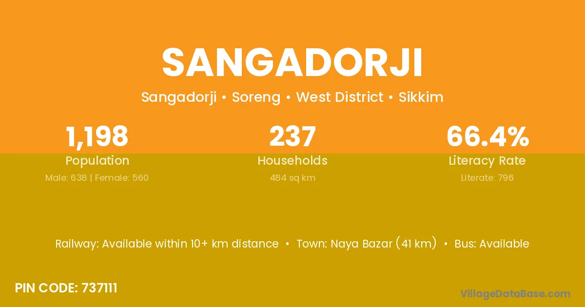 Sangadorji village has a total population of 1,198 people, of which 638 are males and 560 are females.