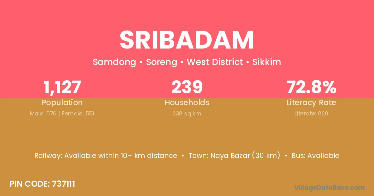 Sribadam village has a total population of 1,127 people, of which 576 are males and 551 are females.