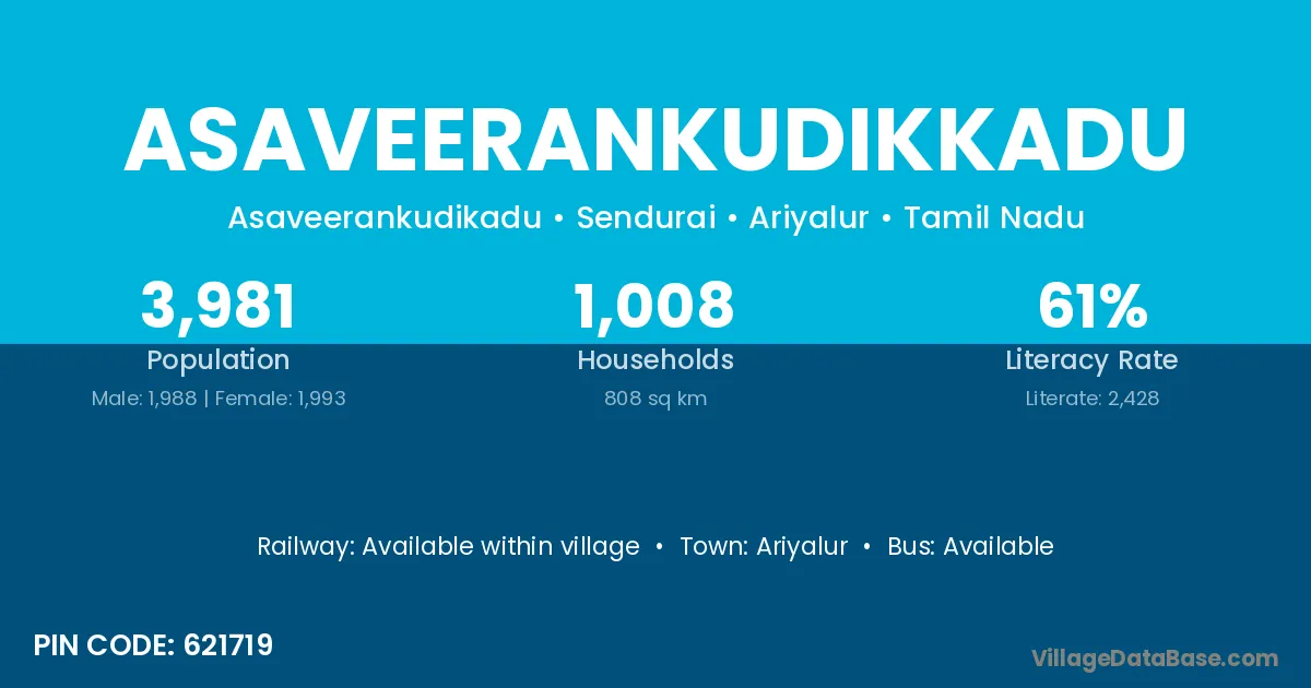 Asaveerankudikkadu village has a total population of 3,981 people, of which 1,988 are males and 1,993 are females.
