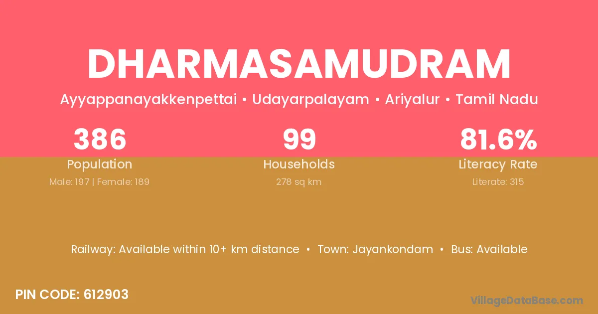 Jayankondam is the nearest town to Dharmasamudram village for major economic activities
