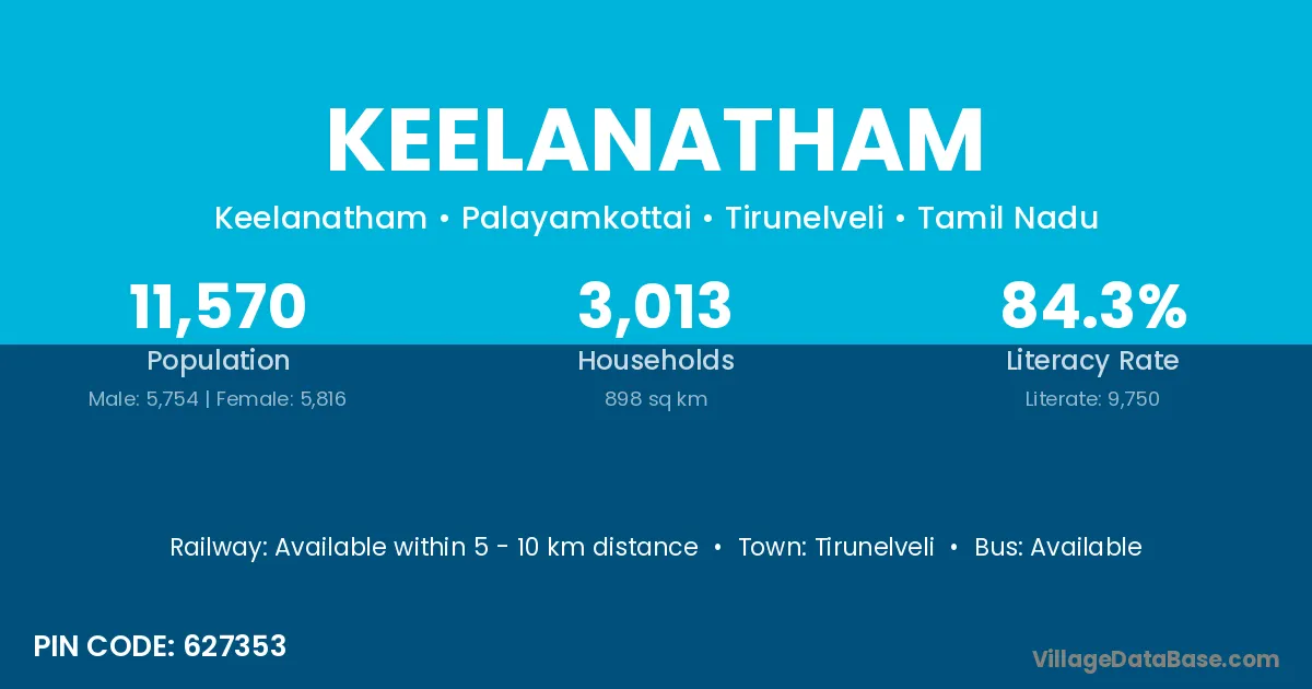 The literacy rate of Keelanatham village is 54.54%. Male literacy stands at 65.28% and female literacy at 44.15%.
