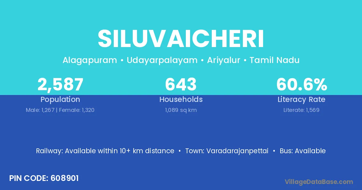 Siluvaicheri village has a total population of 2,587 people, of which 1,267 are males and 1,320 are females.