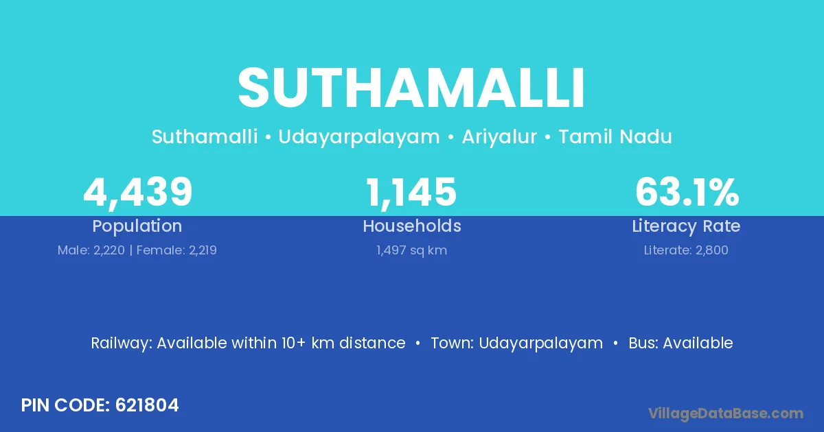 Suthamalli village has a total population of 4,439 people, of which 2,220 are males and 2,219 are females.