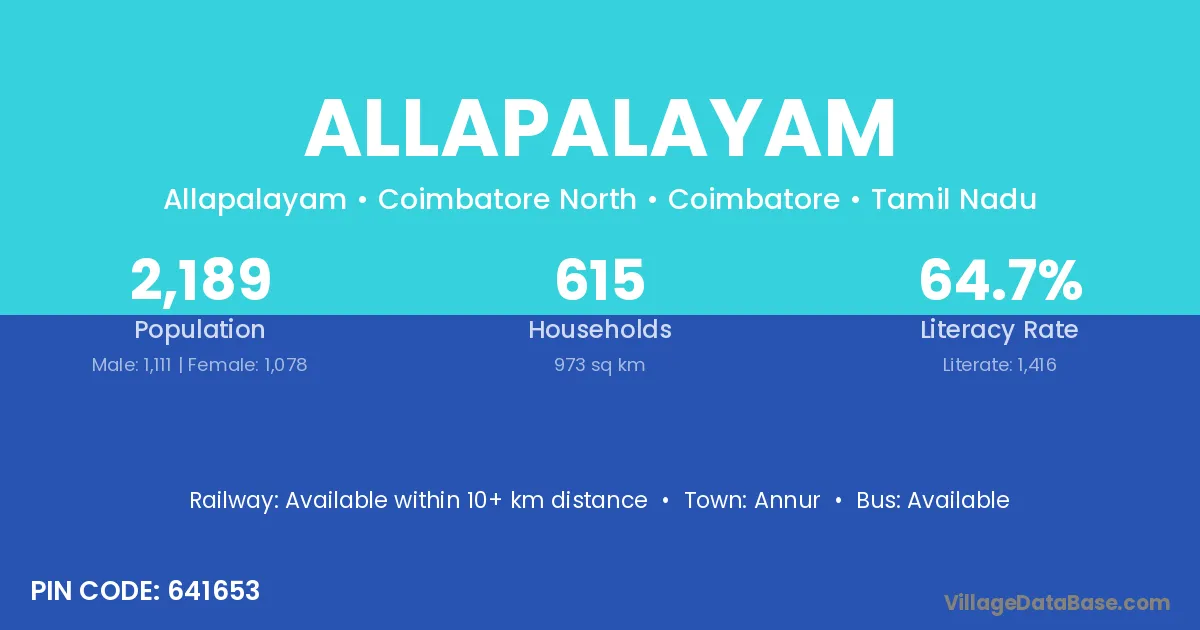 Allapalayam village has a total population of 2,189 people, of which 1,111 are males and 1,078 are females.