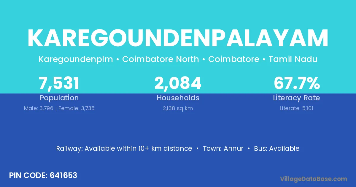 Karegoundenpalayam village has a total population of 7,531 people, of which 3,796 are males and 3,735 are females.